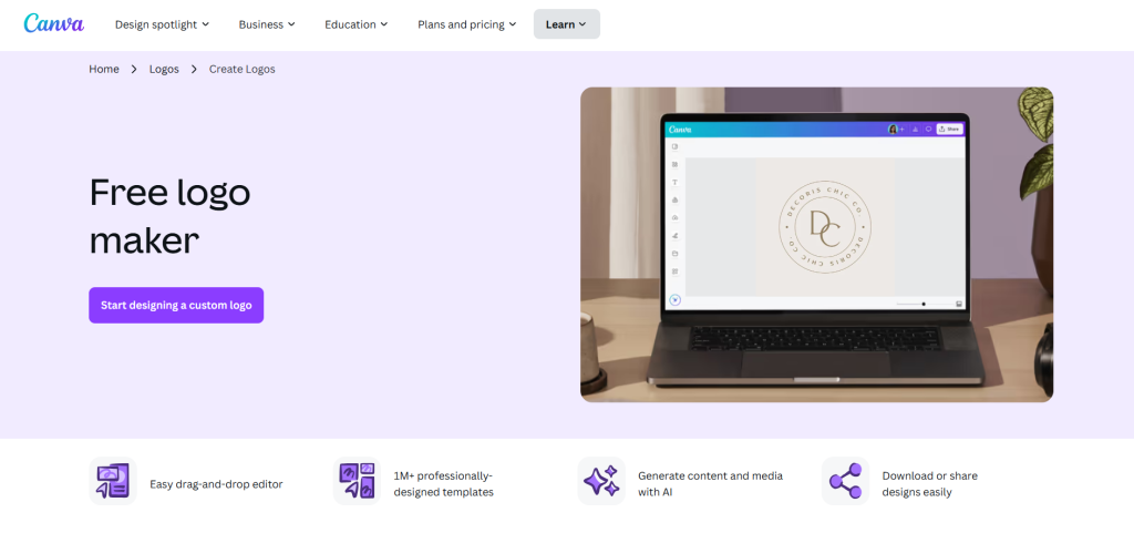 Canva Logo Generator ابزار محبوبی از برند Canva است که با کمک هوش مصنوعی ساخت لوگو، لوگوهایی جذاب و مدرن تولید میکند. با رابط کاربری آسان و صدها قالب آماده، کاربران بدون تجربه طراحی نیز میتوانند لوگوهای حرفهای خلق کنند. قابلیت سفارشیسازی گسترده، از مزیتهای اصلی این ابزار است.