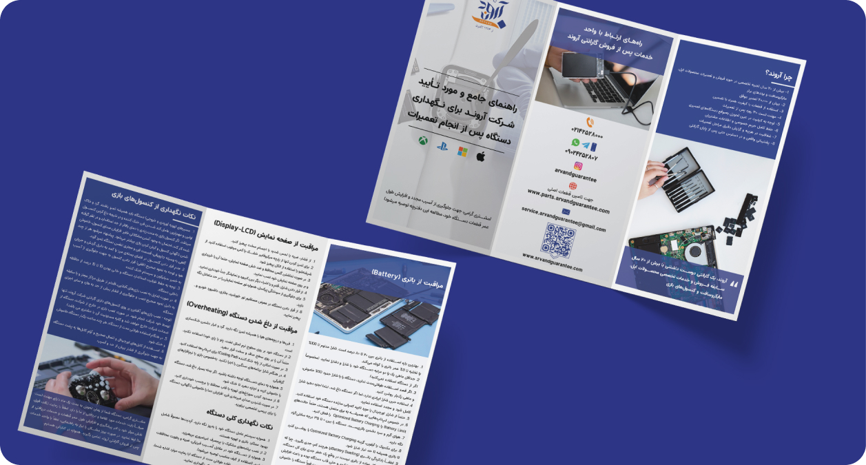 مجموعه کاملی از اقلام چاپی شامل بروشور، کاتالوگ، فرمهای سازمانی و برچسبهای روی کارتن طراحی کردیم تا ظاهر برند در همهجا—از اولین برخورد تا زمان تحویل محصول—هماهنگ و حرفهای باشد. این یکپارچگی بصری باعث شد برند گارانتی آروند شفافتر دیده شود، اعتماد مشتریان افزایش پیدا کند و تجربهای منظم و قابلاعتماد در تمام مراحل ارتباط شکل بگیرد.