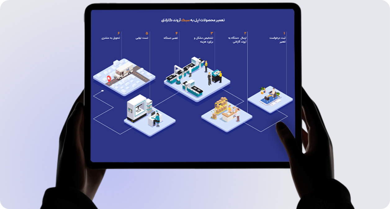 در پروژه آروند، برای بخش مراحل تعمیرات طراحی اختصاصی انجام دادیم تا این فرآیند بهصورت شفاف، منظم و جذاب برای کاربرانی که دغدغه دریافت این خدمات را دارند، نمایش داده شود. هر مرحله به طوری طراحی شد تا کاربر مسیر خدمات را بهراحتی دنبال کند و با اطمینان بیشتری اقدام به ثبت درخواست نماید.